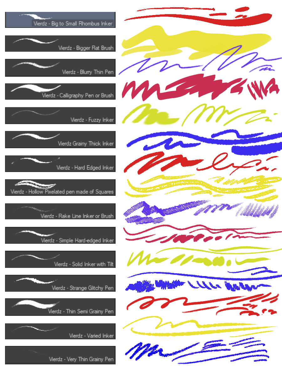 This is a pack of 15 Clip Studio Paint brushes! Some were made back in 2019 when I first started using CSP. I made most of them with the purpose of being inkers/liners, and the large "Bigger Flat Brush" was intended to be a "fill" type brush for large areas of "ink". Use them as you'd like to!