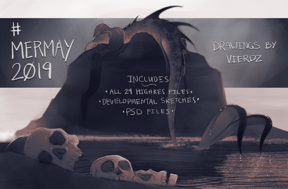 In 2019 I was inspired to draw a series of illustrations for the month of May based on #MerMay. You can view them all on my ArtStation. In this bundle are extra sketches and the full resolution artwork. Also included are all PSD files for each artwork. This was the last month I used Photoshop for my work, so for me personally I mark MerMay as the beginning of a transformation into a new art style as I transitioned into using Clip Studio Paint almost immediately afterwards.