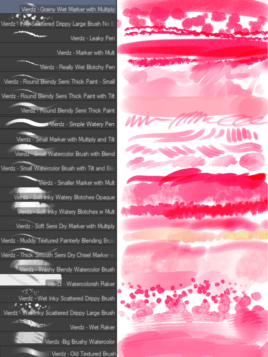 This is a pack of 26 Clip Studio Paint brushes! These are some of my absolute favorite brushes to work with, besides some of the ones in the "Grainy" brush pack. I intended them to imitate paint, wet ink, or markers.